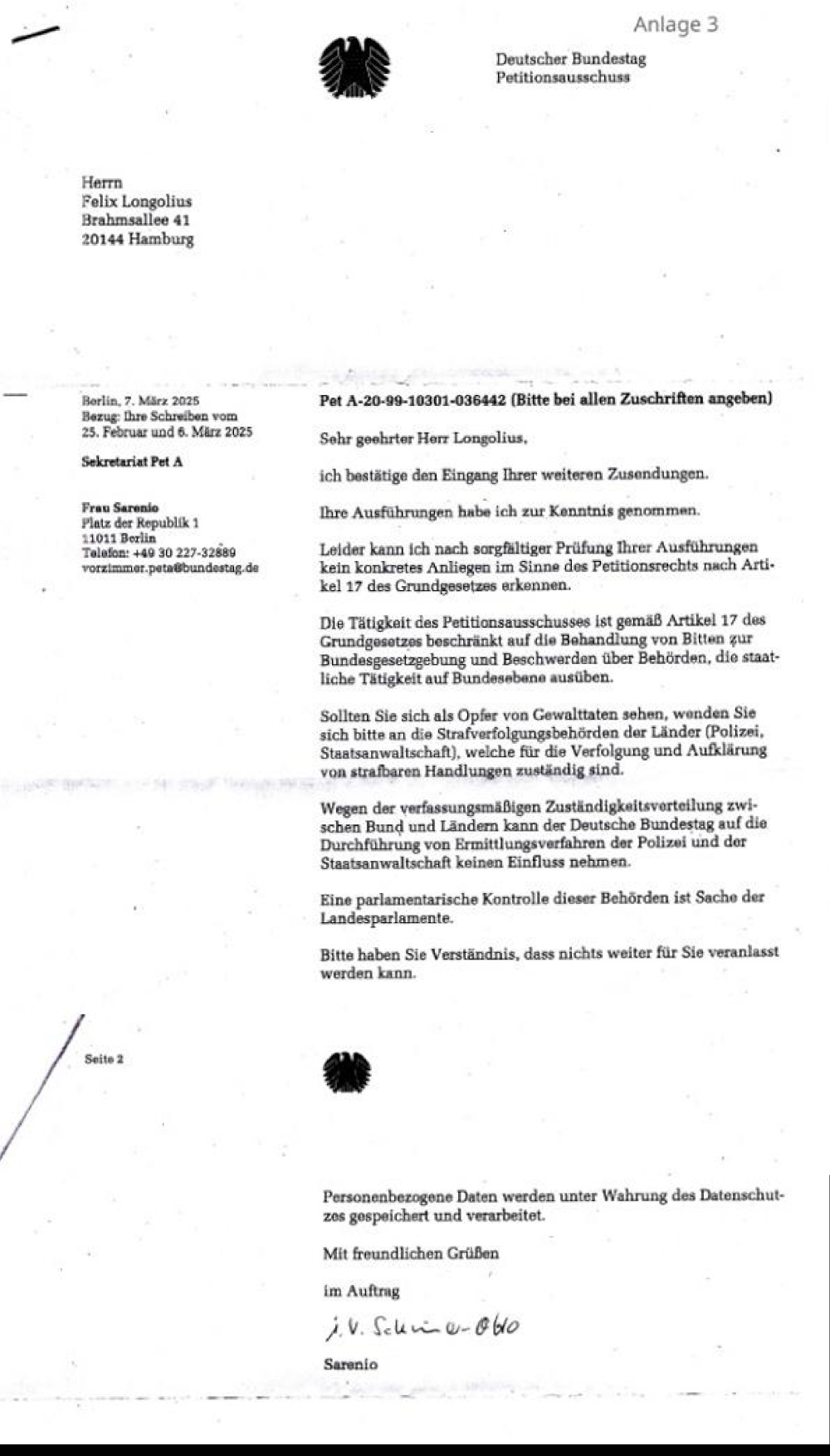 Bundestags-Petition; Opferschaft von Gewalttaten zugeordnet; Bundestag nicht bemüht, im Jahre 2025 eine Gesetzgebung zur Elektrostrahlfolter, Gang-Stalking und Einflüsterungen zu suchen. Den Bericht des Schau-Folteropfers und Testkunden des Psychiatriewesens, Felix Longolius, so abzuschmettern.