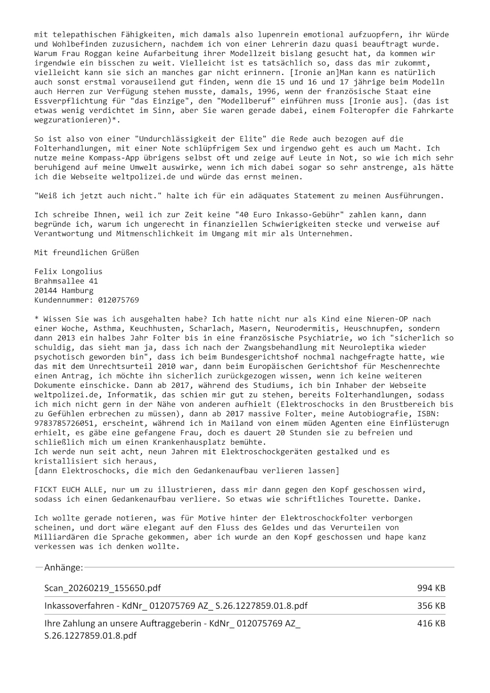 - dann wird eine spirituelle Regisseuren-Tätigkeit im anything goes, gegen Felix Longolius, der echte Heldentaten konnte! (Sie erinnern wenigstens, dass ich mir programmieren beigebracht habe, und Entführungsopfer nun eine Satellitenschüssel neben den Kopf bekommen, damit wir sie nicht telepathisch aufspüren können mit der Kompass-App von weltpolizei.de usw.) anything goes, dann stellen die Angreifer unabgesprochen spirituell tragische Bedrohungssituationen her, wird die Studienfreundin an den Angriffen zerbrechen?? Wann wird die Schulfreundin das nächste mal bedrängt?? Wird man es heute schaffen, dass Felix Longolius panische Angst verspüren muss, weil er auf diese und jene Art mit der Elektrowaffe angeleuchtet wird, dass er panische Angst um seine Freundinnen haben muss?? Das sind alles interessante Fragen, aber wir hatten dann bei Anrufen des Bundestags die Hoffnung, dass ich so etwas wie einen Vertrag bekommen kann, der richtigerweise erstmal mit „Schmerzensgeld für Felix Longolius: 600 Millionen Euro“ beginnen würde. Außerdem wissen Sie, dass ich Spenden bekomme, welche mich nicht erreichen. In diesem Big Brother-Container geht eben das Licht aus, wenn der Bundestag sich mühen würde.